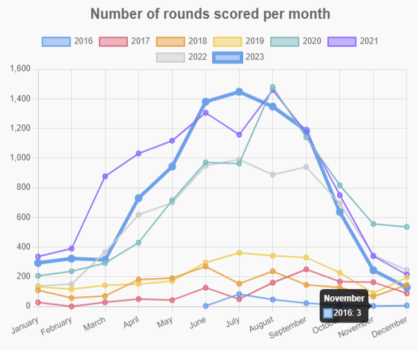 CourseStats offers UDisc course ambassadors a way to turn statistics into charts. Download the csv file from your Course Tools and use this service to get charts that you can share with your local club, players or post on social media.
